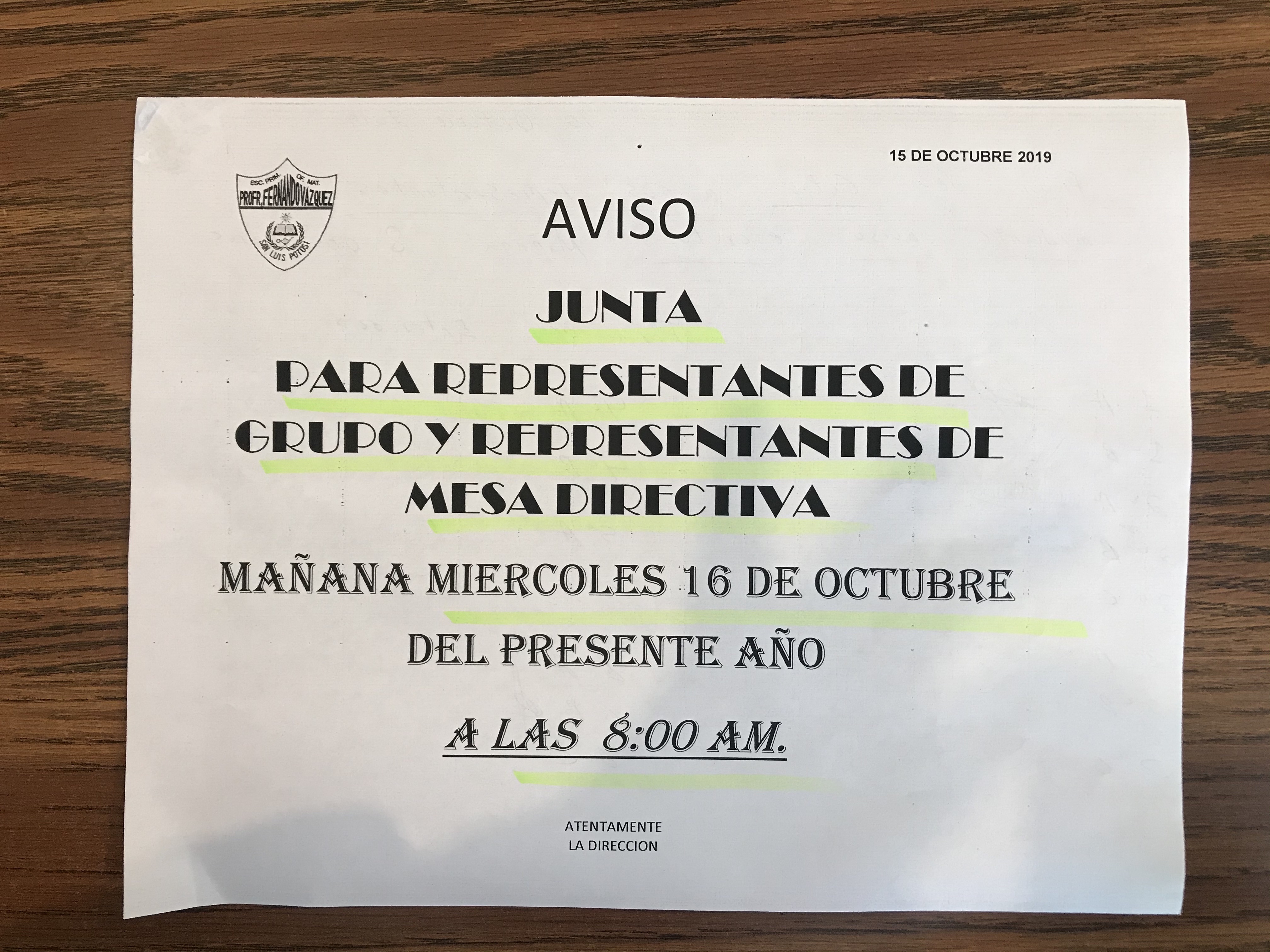 Aviso de junta en el salón